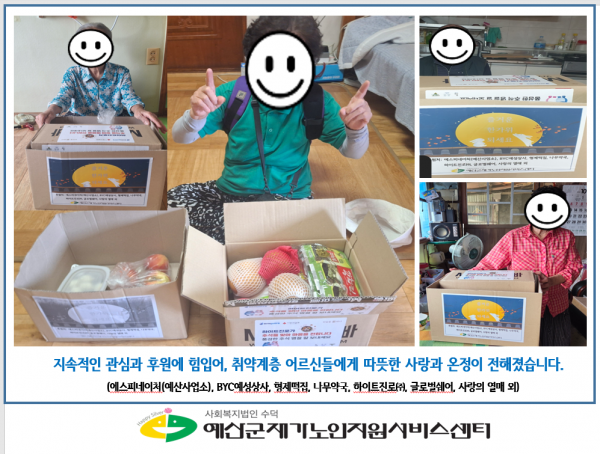 에스피네이처(예산사업소)에서는 사과를, BYC예성상사와 나무약국에서는 현금 후원을 통해 물품을 마련하였으며,