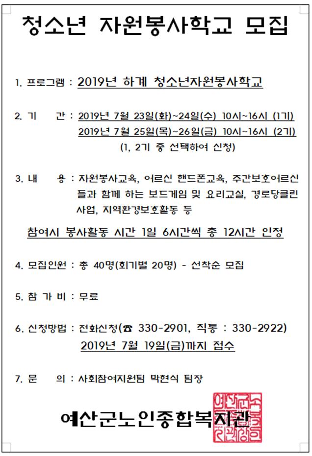 2019년 하계 청소년 자원봉사학교 참여자 모집 페이지 정보 작성자 관리자 댓글 0건 조회 5,905회 작성일 19-05-22 16:49 목록 본문 이전글2019년 하계 사회복지현장실습 최종 선정 명단 공지 19.05.29 다음글5월 시니어뷰티 아카데미 참여자 모집 19.05.08 댓글 0 댓글목록 등록된 댓글이 없습니다.